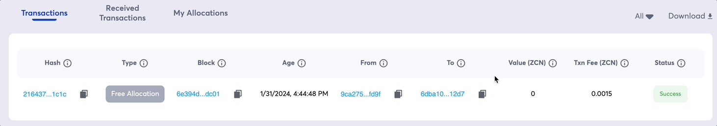 <table><thead><tr><th width="203">Column Name</th><th>Description</th></tr></thead><tbody><tr><td>Allocation ID</td><td>This is the Identifier of the allocation, with a copy icon to copy it to the clipboard. Clicking on it redirects to the <a href="allocation-details-page">Allocation Details page</a> of this Allocation.</td></tr><tr><td>Data Shards</td><td>This is the count of data shards involving in this allocation. Data shards count decides how many blobbers that the allocation data will be split among.</td></tr><tr><td>Parity Shards</td><td>This is the count of parity shards involving in this allocation. Parity shards are replicas of the data shards that are used for data protection and fault tolerance. This count also decides how many blobbers will involve in carrying those parity shards. </td></tr><tr><td>Size</td><td>This is the maximum storage space of this allocation.</td></tr><tr><td>Expiration Date</td><td>This is when the allocation will expire, meaning it will not be able to receive more data of the client.</td></tr></tbody></table>