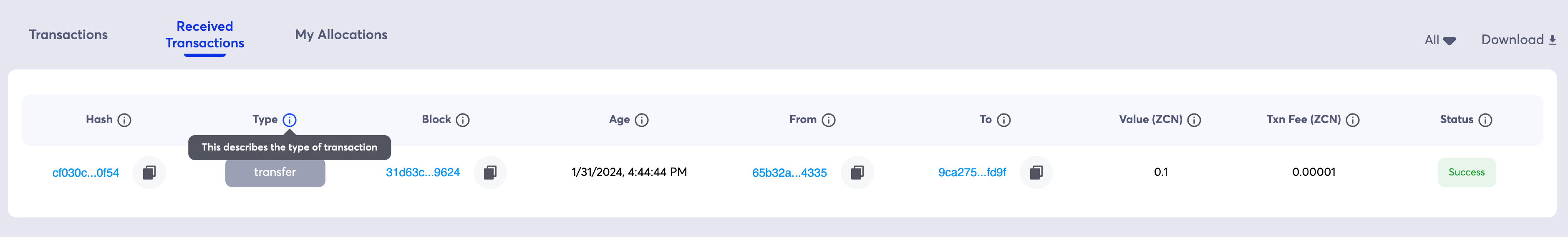 This table shows information about transactions received by this wallet i.e. this wallet should appear in the `To` field of these transactions. This table shows the same information as in the Transactions table in the [Blockchain Page](https://docs.zus.network/zus-docs/webapps/atlus/blockchain-page) in Atlus.