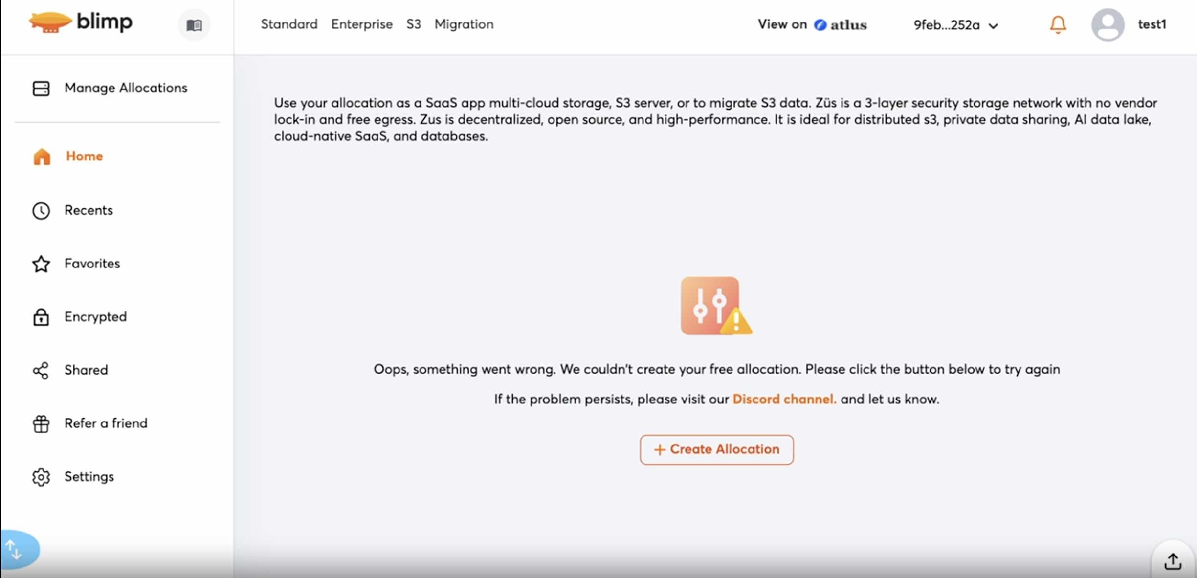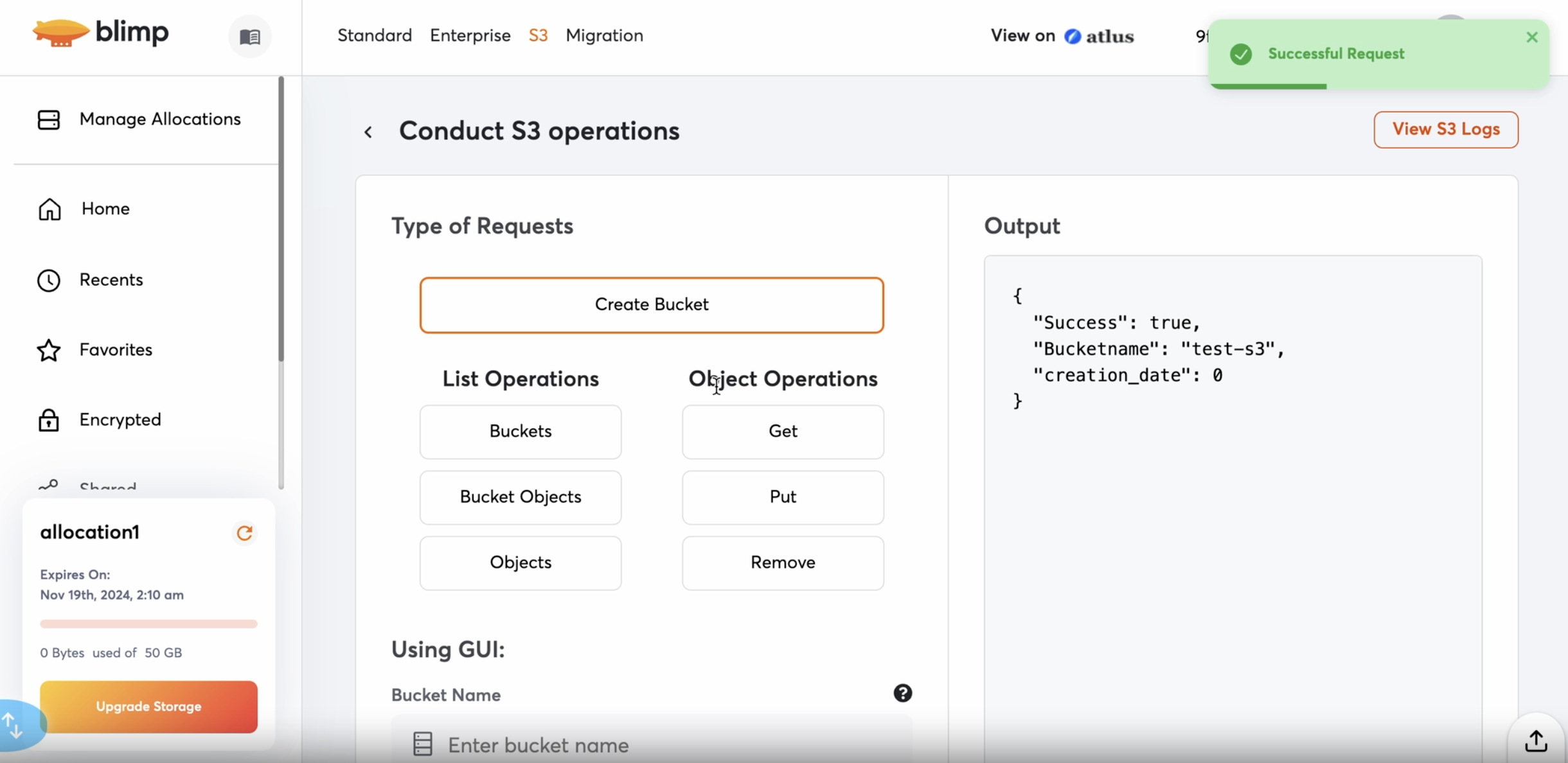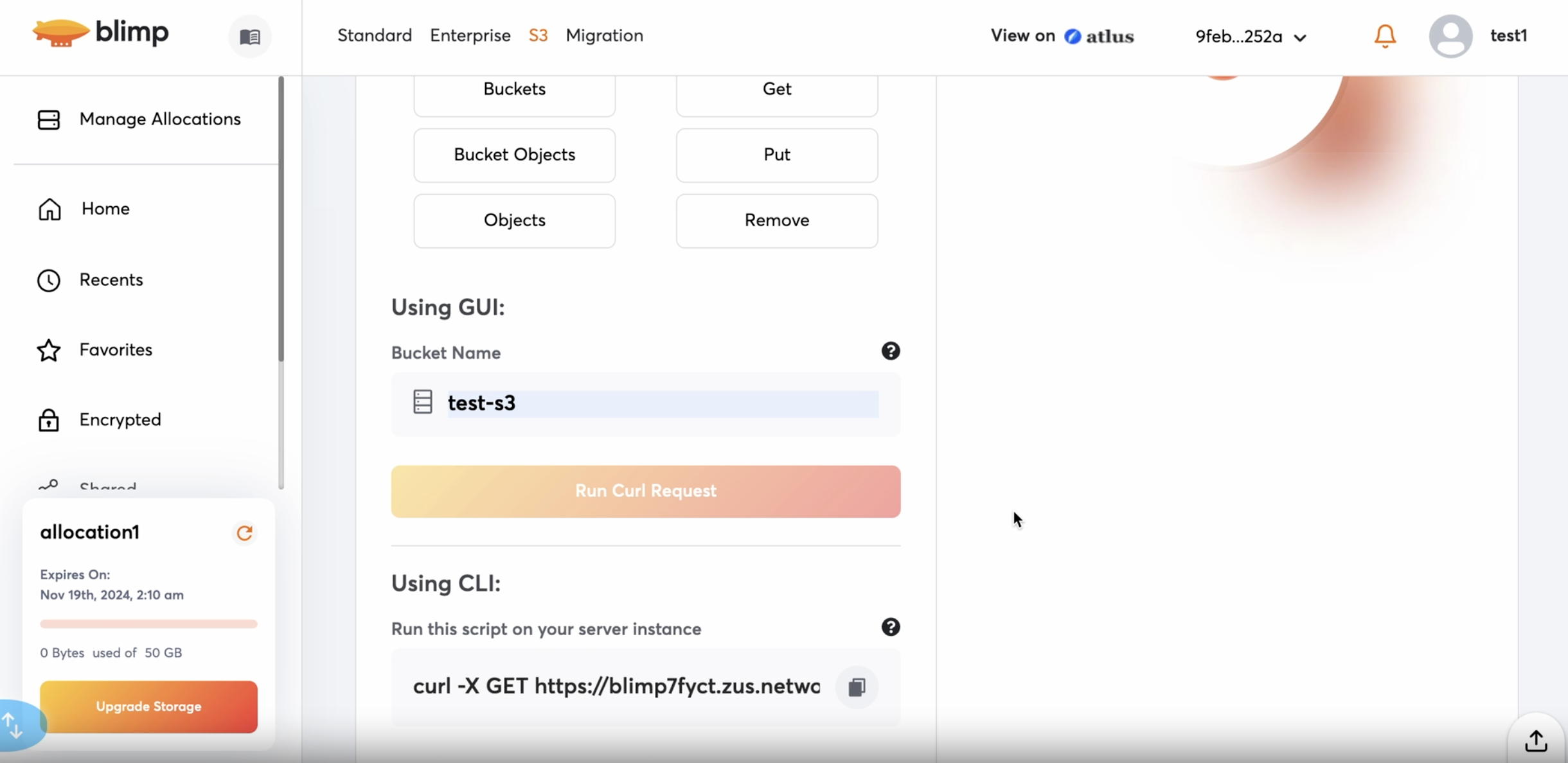 * Open **Blimp UI** and go to the **S3** tab. Select your allocation.