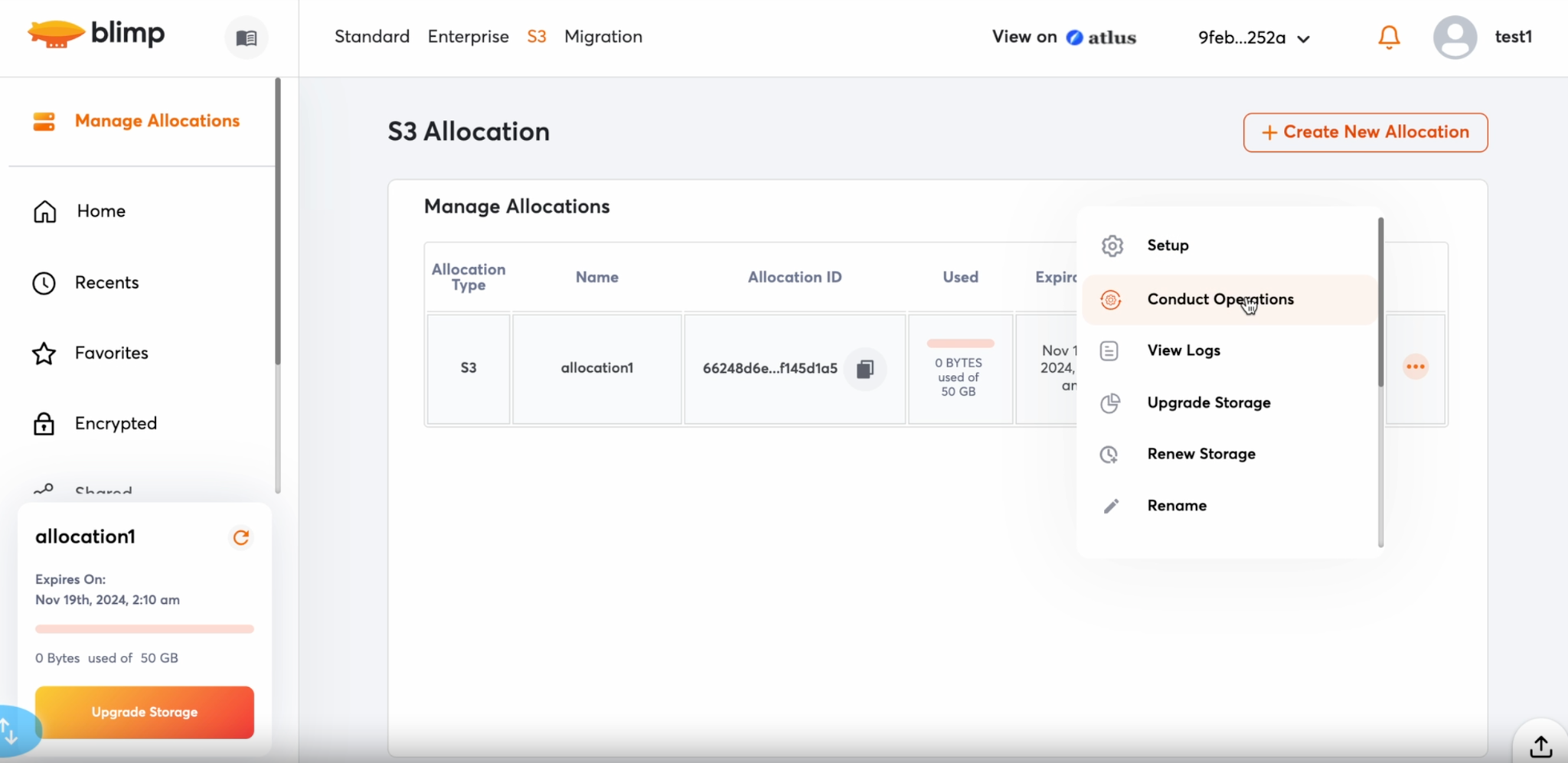 * Go to the **Blimp UI** and navigate to the **S3** section. Select your allocation and click on the three dots to open the options menu. Click on **Conduct Operations**.