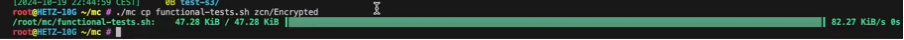 * Use the MinIO client to copy `functional-tests.sh` to the **Encrypted** folder. This command moves `functional-tests.sh` into the **Encrypted** folder, securing it.