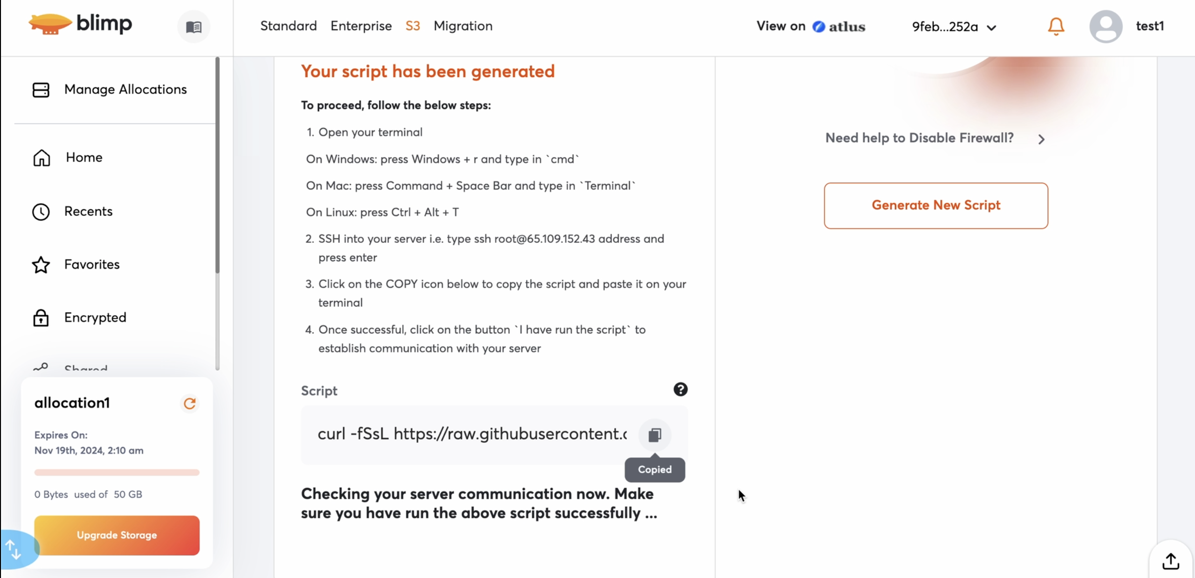 Once the script runs successfully, Blimp will automatically detect your server and guide you to the next step.