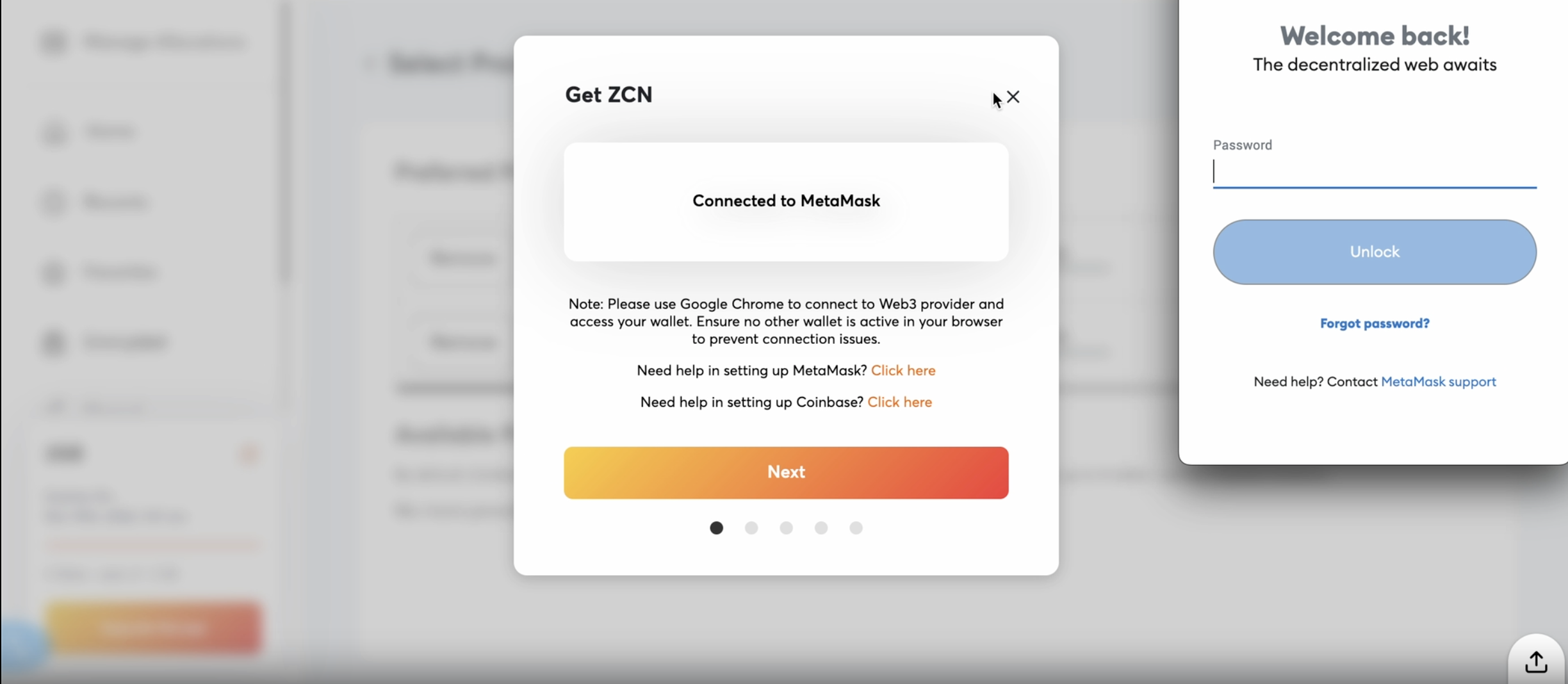 * You can pay using ZCN from your existing balance. To do so, you'll need to connect your Metamask wallet. Additionally, you have the option to purchase more ZCN if needed.
