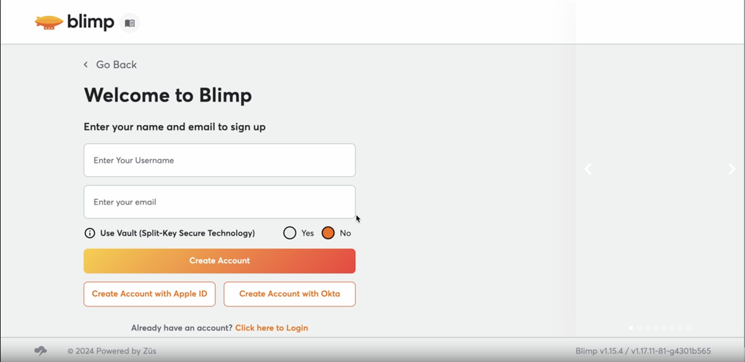 * Open the Blimp user interface and click on **Sign up**.&#x20;