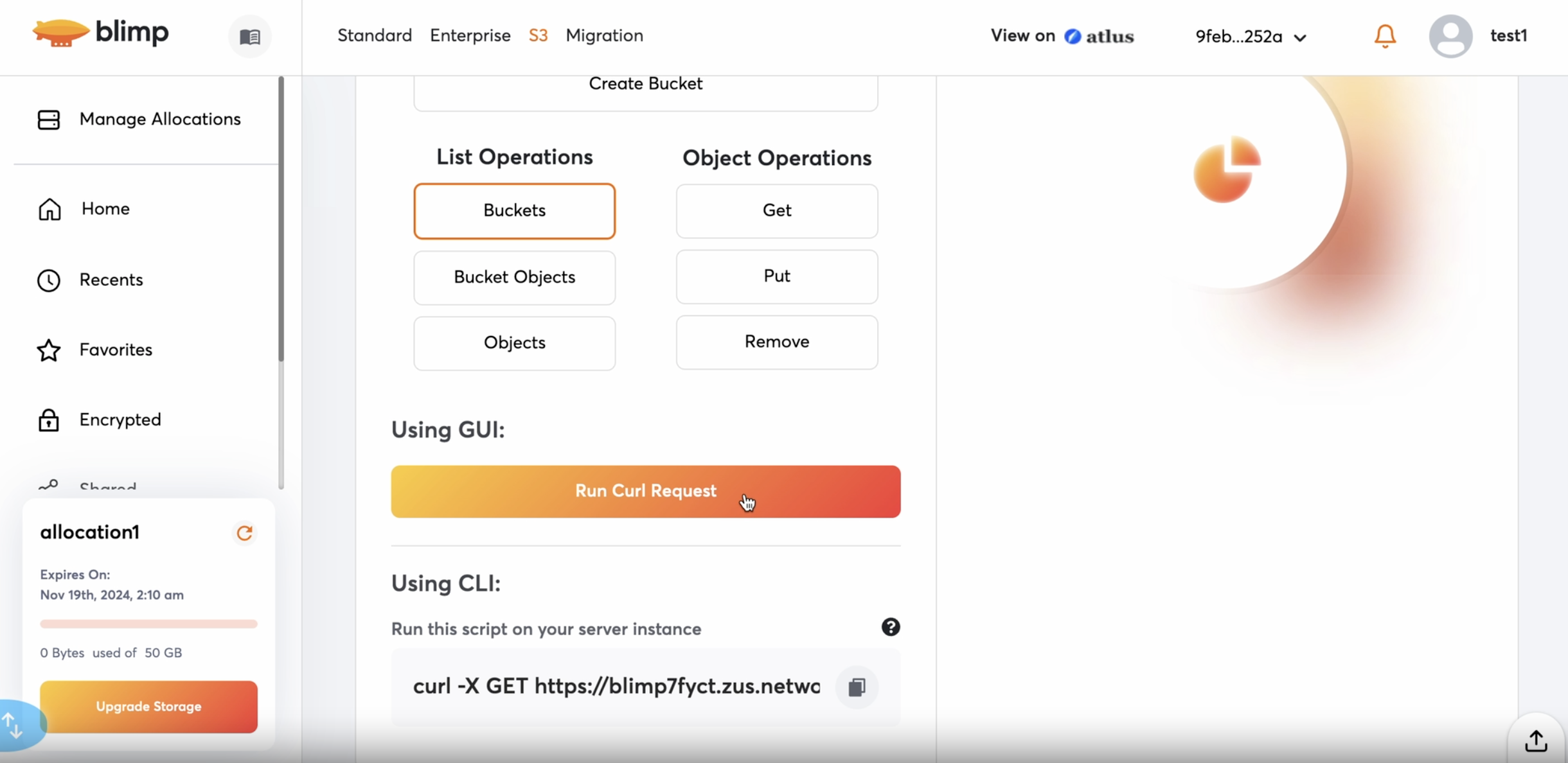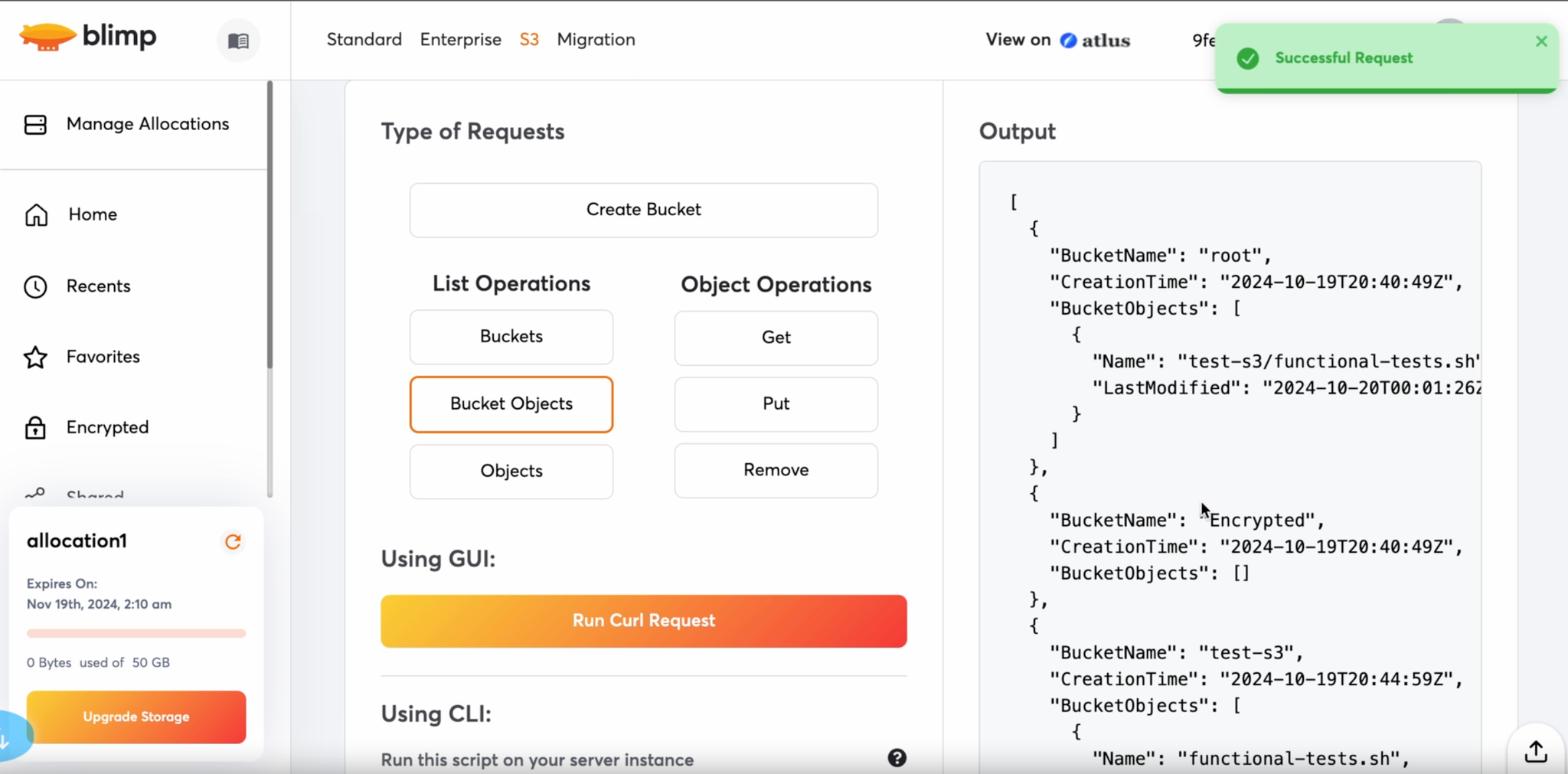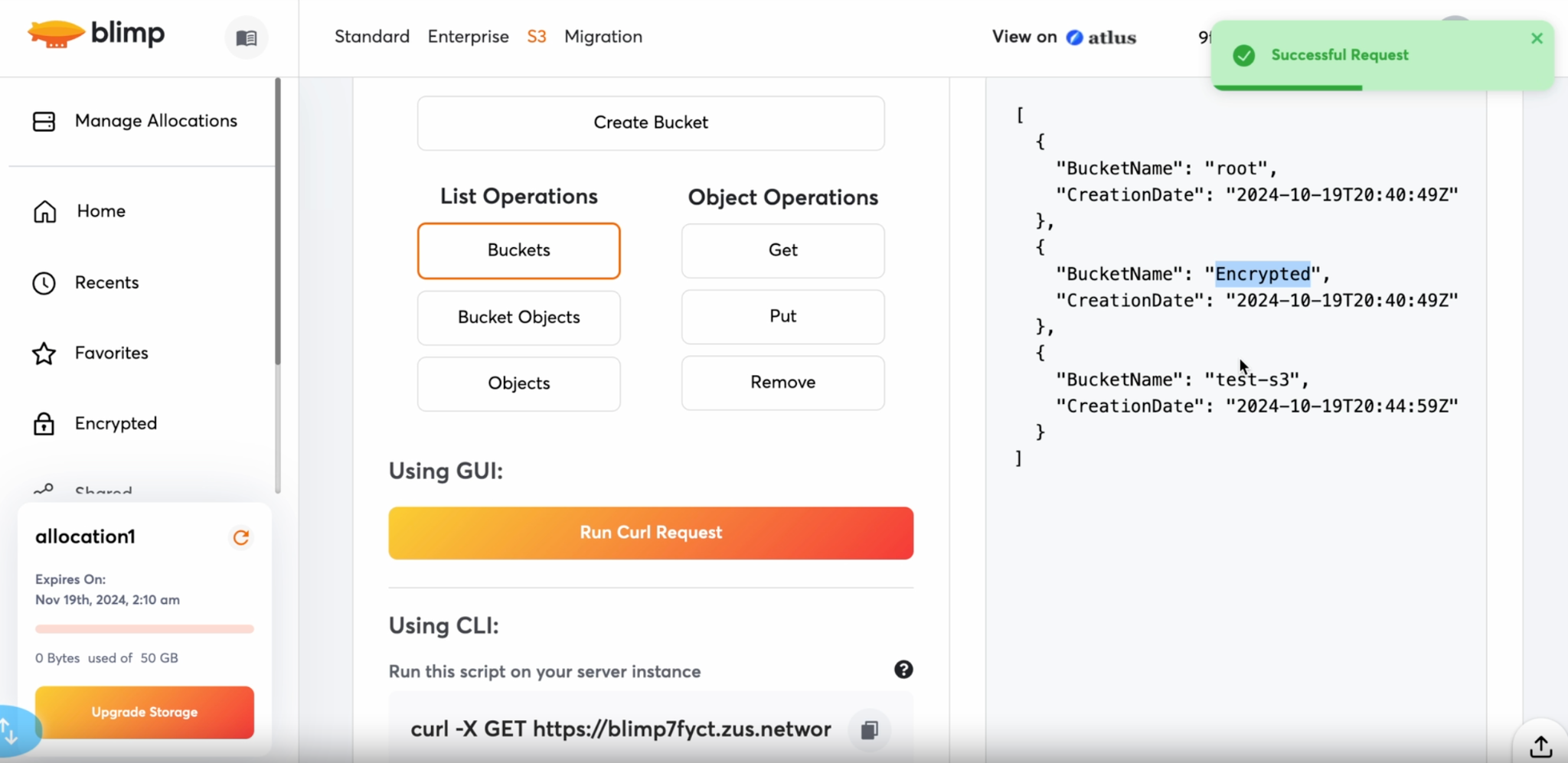 * **List Existing Buckets**: Choose **Buckets** from the **List Operations** section under the **Type of Request** menu. Click on **Run cURL Request** to view the list of buckets.