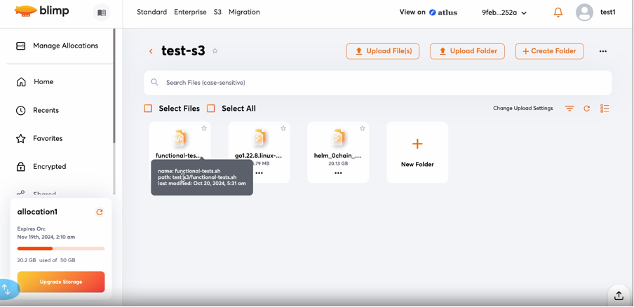 * Open **Blimp UI** and navigate to the **Home** page. Click on the **Encrypted** folder to check if `functional-tests.sh` appears.
