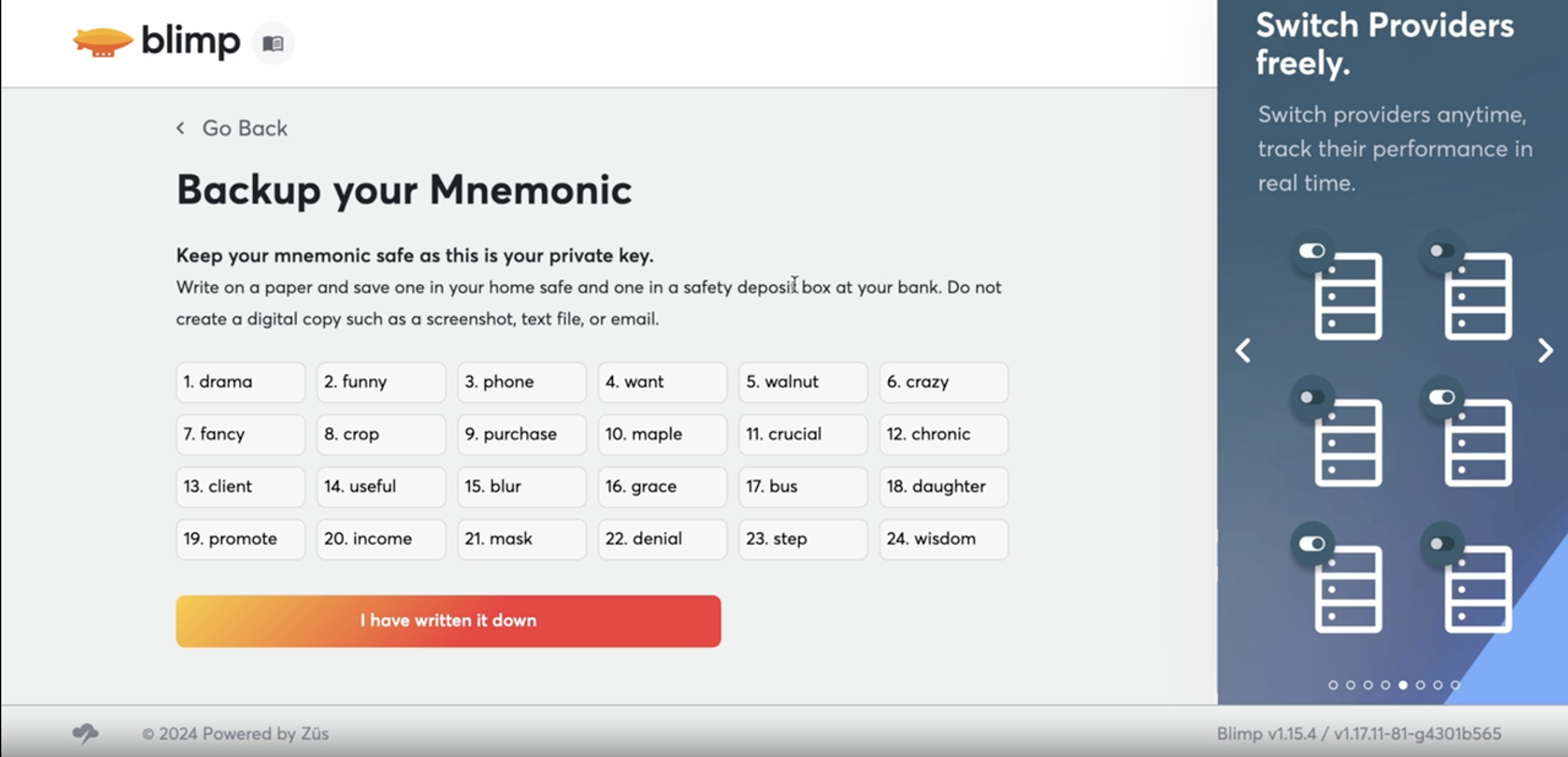 * After verifying your mobile number, you will be presented with your wallet mnemonics—a set of 24 unique words used to generate your wallet’s private key.