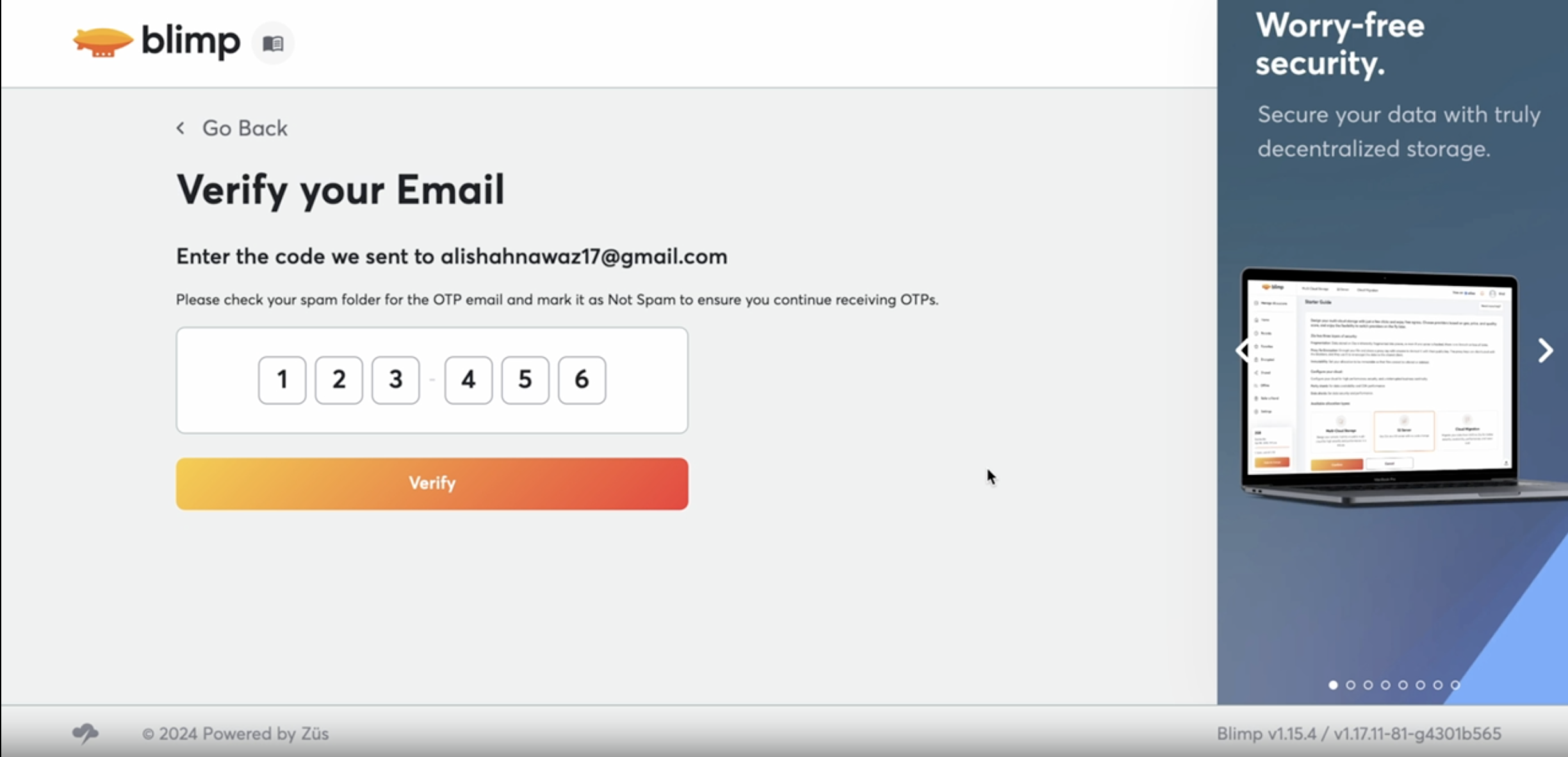 * Check your email inbox for a one-time password (OTP). Enter the OTP in the Blimp UI to verify your email address.