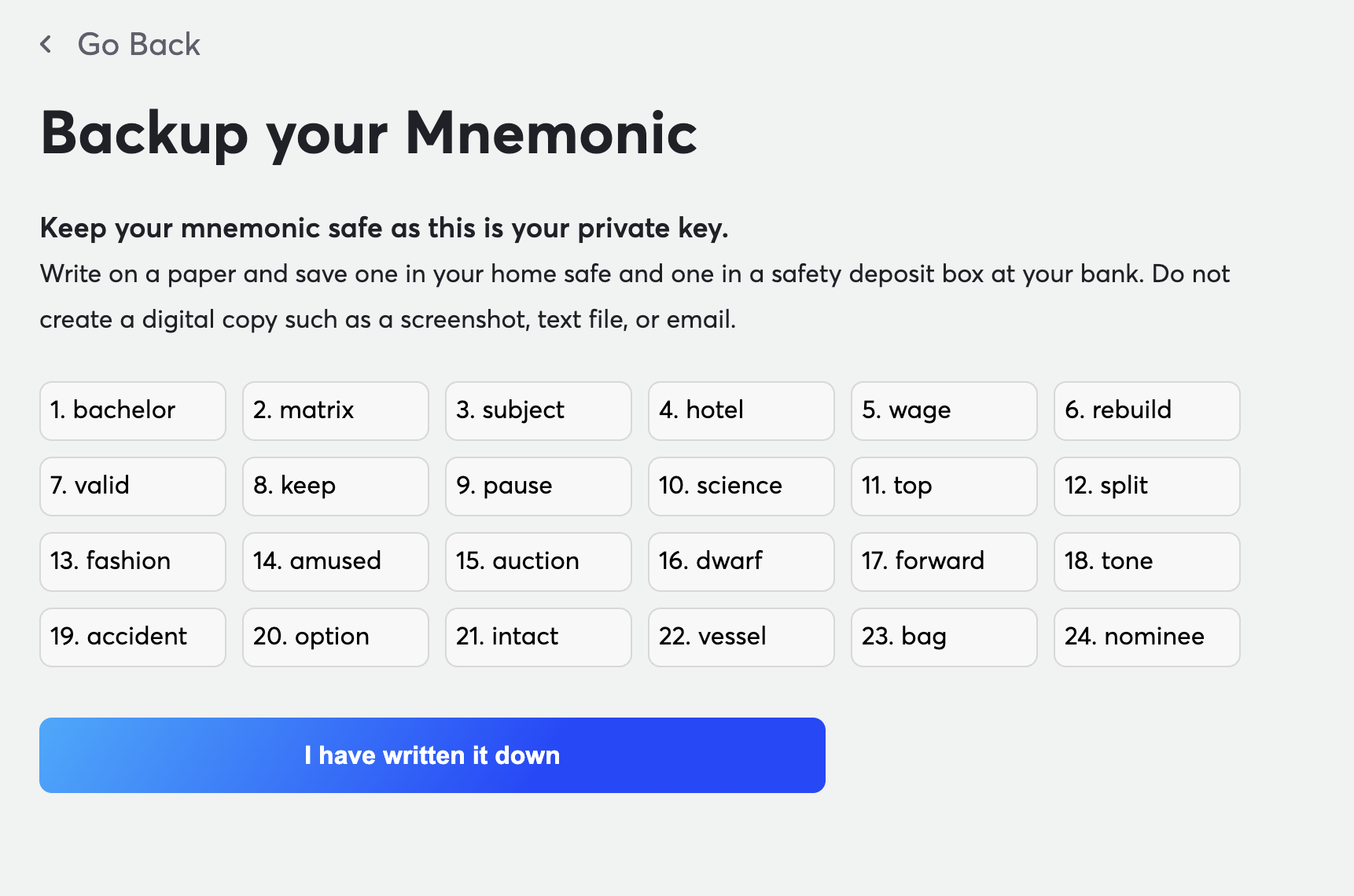 After you verify your phone, you'll be shown you Wallet Mnemonics, which are basically 24 words that are used to generate your wallet's private key.