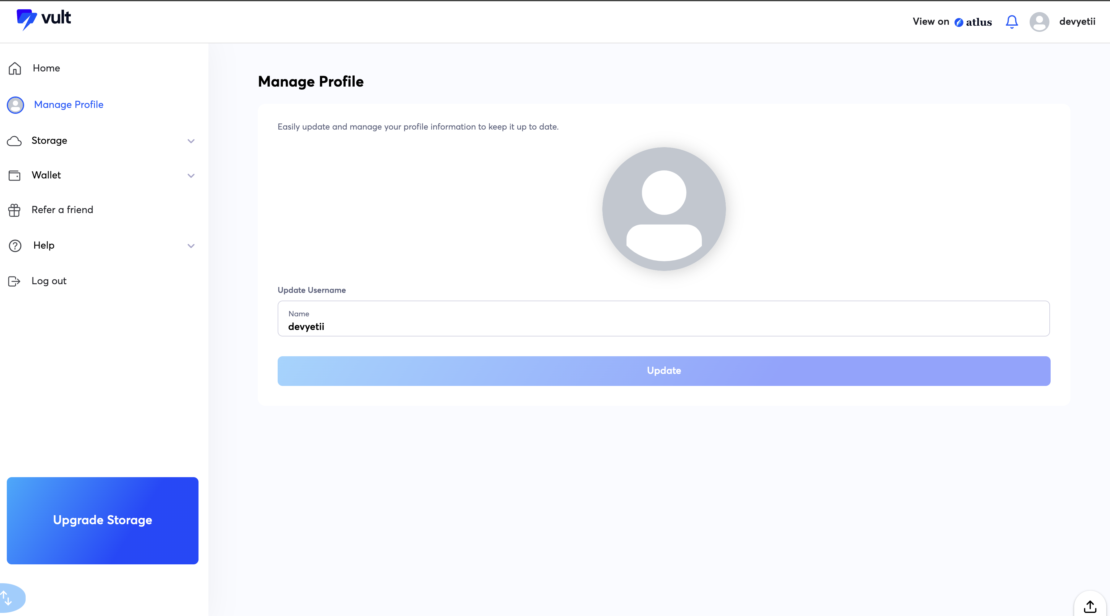 This page shows you the settings of your Vult allocation and gives you access to some controls over it. Check [Storage Management Dashboard](https://docs.zus.network/zus-docs/webapps/vult/storage-management-dashboard) for more details.