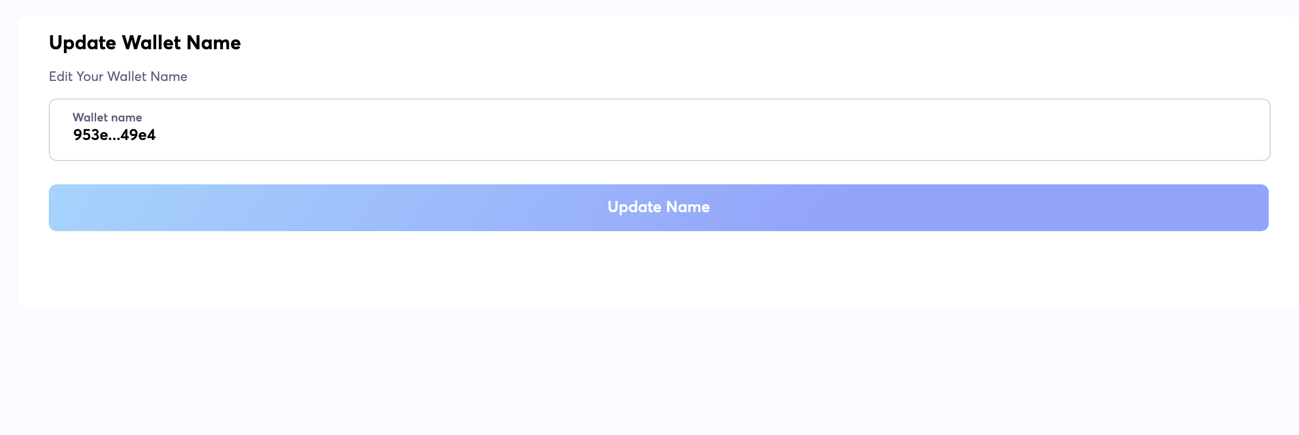 <figure><img src="https://2414485336-files.gitbook.io/~/files/v0/b/gitbook-x-prod.appspot.com/o/spaces%2FUGN3Vu2Hi1voQQLrIVGO%2Fuploads%2F3UQrn8kbQ1XcERbi7z9b%2Fimage.png?alt=media&#x26;token=f8efac64-4eb3-4d3c-9b7c-9255f9aea650" alt=""><figcaption><p>Fig9: Update Wallet Name</p></figcaption></figure>