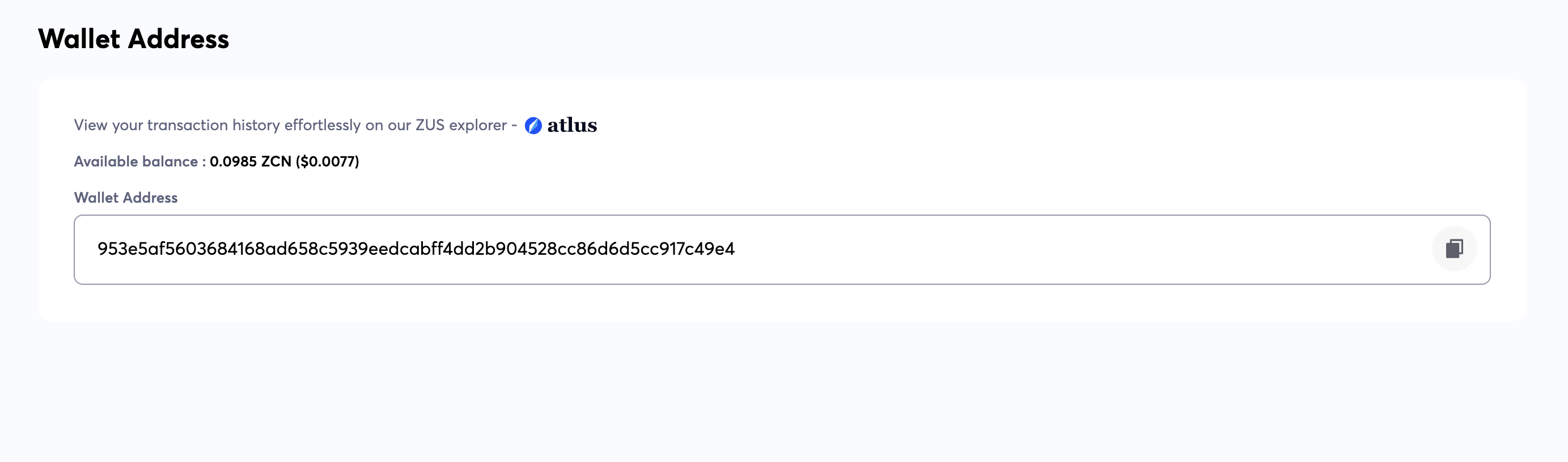 **Your Wallet Address:** View and Copy your wallet address. Click on "Atlus" to view your transaction history on Atlus.