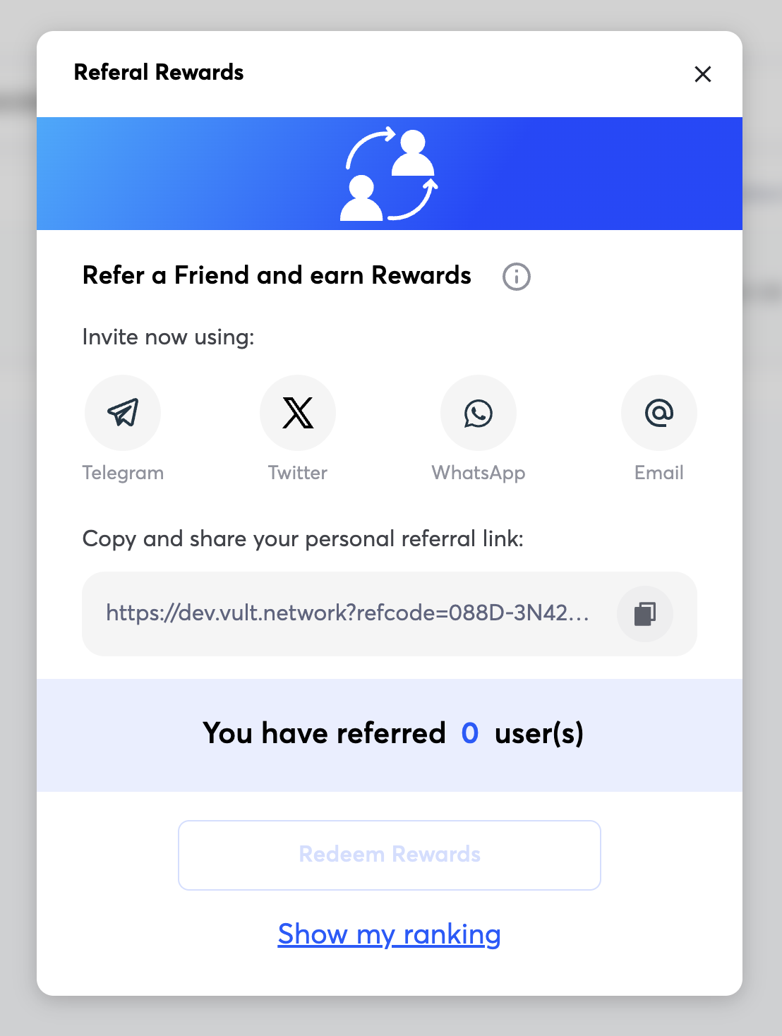 **Redeem Rewards:** Click "Redeem Rewards" to receive rewards after accruing referral earnings.\
