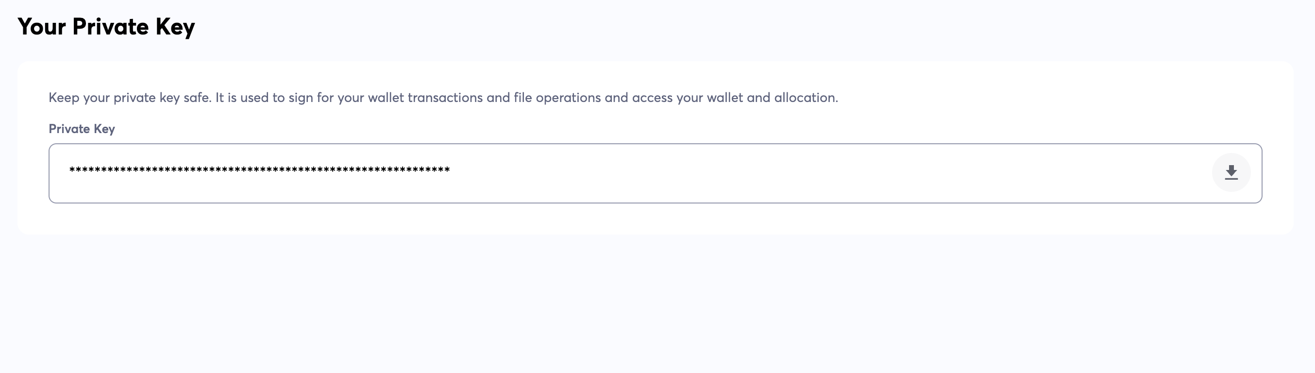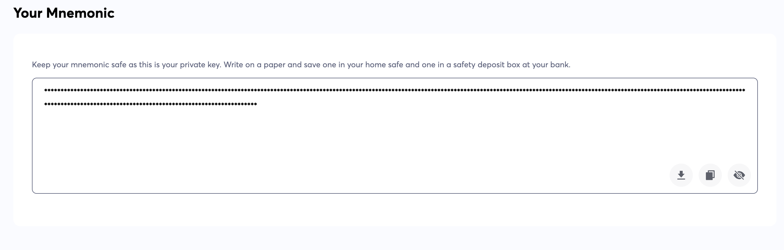 **Your Private Key:** Similar to Mnemonic, your private key can give access and control over your account. Make sure to keep it secure. If you have your Mnemonic safe and secure, there is no need to save this one. If saved, keep it offline, and do not share it with anyone.