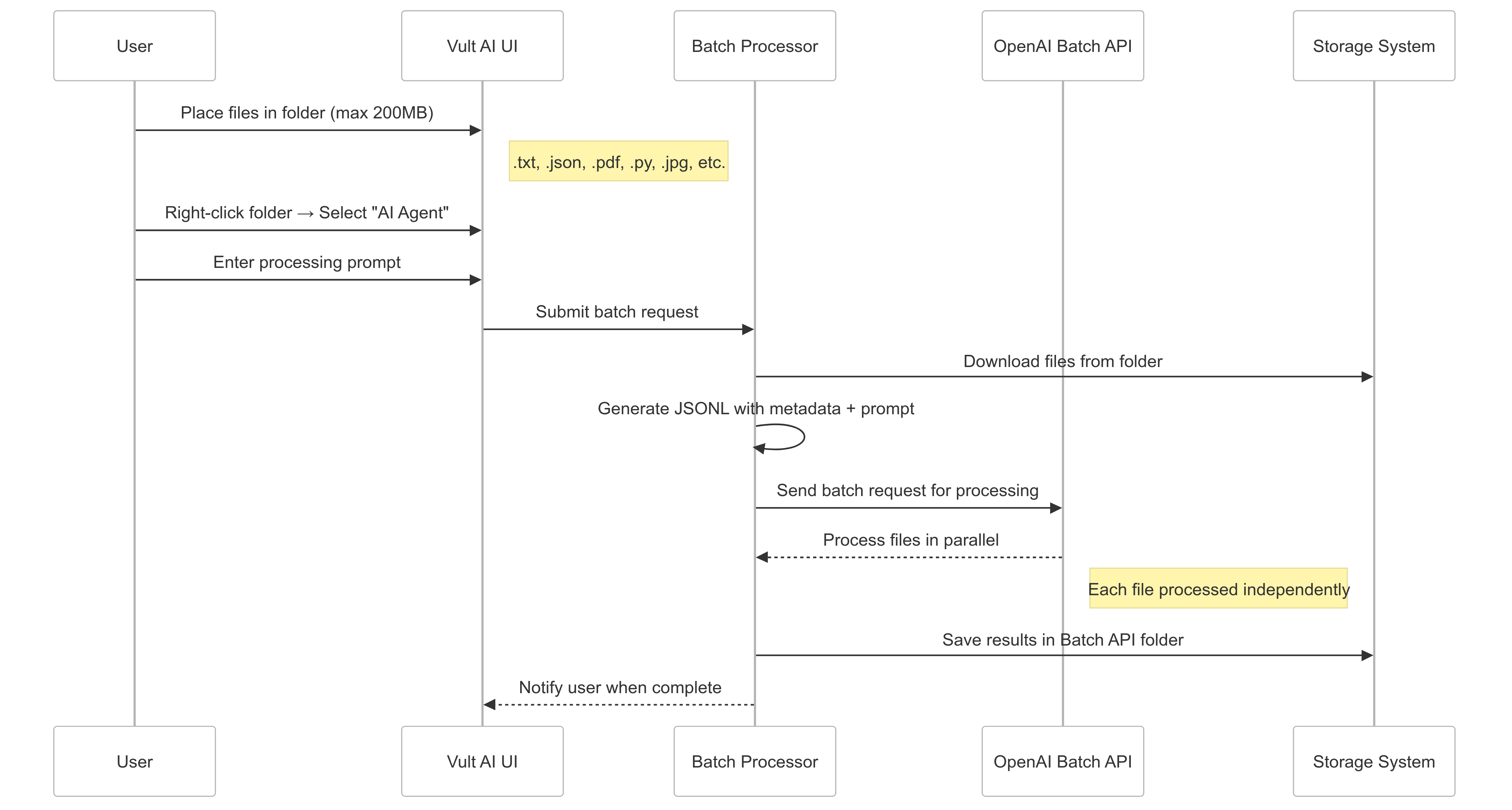 Additionally, session tracking and storage ensure that batch results are stored in the AI Agent Folder or Batch API Folder, allowing users to track processing progress and easily retrieve past batch results.